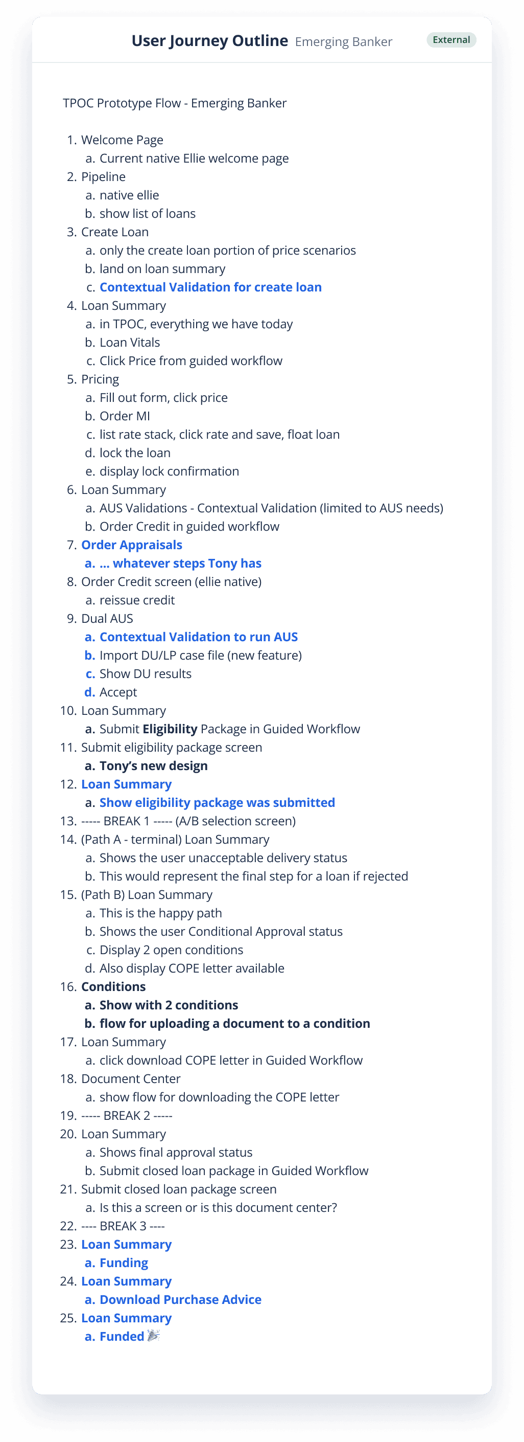Understand the mapping of the full loan servicing process, and then make a list of what steps a user is going to take in their UX journey, taking note of the conditional logic that could effect the users experience and how to guide them through it.